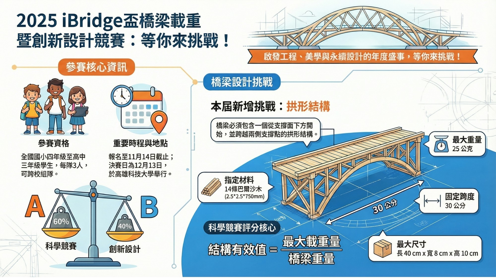 橋梁工程兼具技術、美學與永續意涵,「iBridge盃橋梁載重暨創新設計競賽」自 2023 年首辦以來,廣受好評。今年由 國立高雄科技大學土木工程系 主辦,亞太能源科學教育協會 協辦,再度邀請全國學子一同挑戰工程與創意的極限。