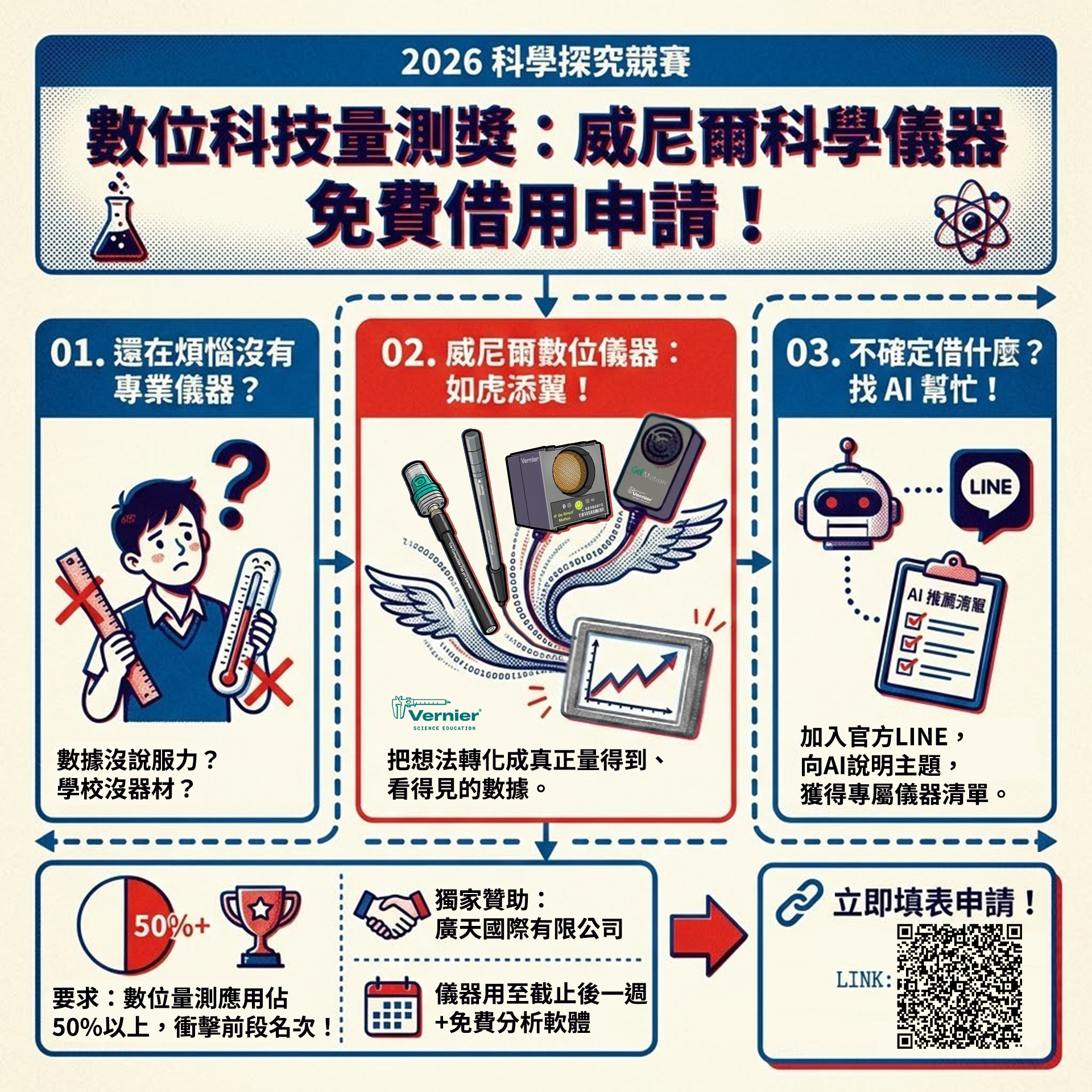 一、 計畫宗旨 在科學探究的過程中,精準的「量測」是驗證假設的關鍵。為了不讓硬體設備限制學子的創意,本競賽特別設立「數位科技量測獎」,並由廣天國際有限公司獨家贊助,提供世界級的 Vernier 威尼爾科學儀器供參賽隊伍免費借用。我們鼓勵參賽者將想法轉化為真正量得到、看得見的數據,提升作品的科學價值與說服力。